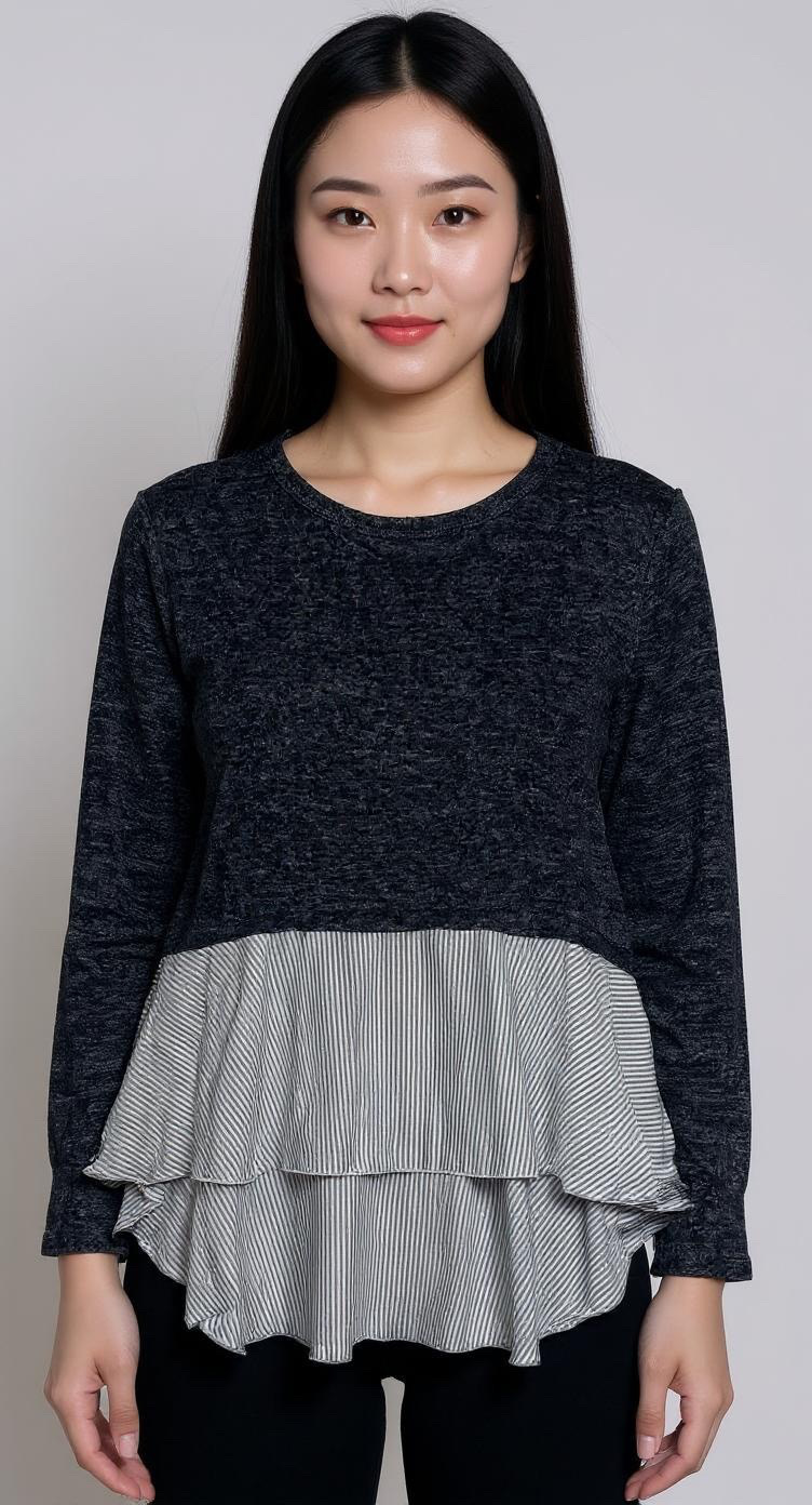 Women’s 75% Rayon, 25% Polyester, Shell 2: 21% Polyester, 75% Rayon, Knit Stripe Ruffle Tiered Button Long Sleeve Top