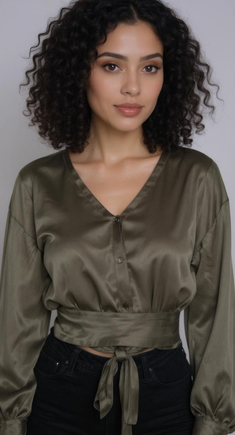 Women’s 100 % Polyester, Balloon Sleeve V-Neck Tie Waist Crop Boho Jennifer Top Blouse