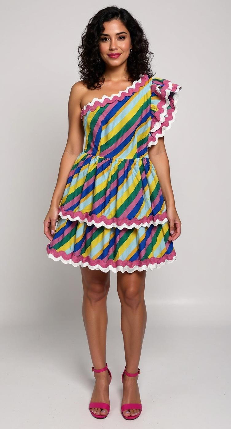 Women’s Cotton/polyester/spandex, Stripe Print One Shoulder Cap Sleeve Rick Rack Trim Mini Dress